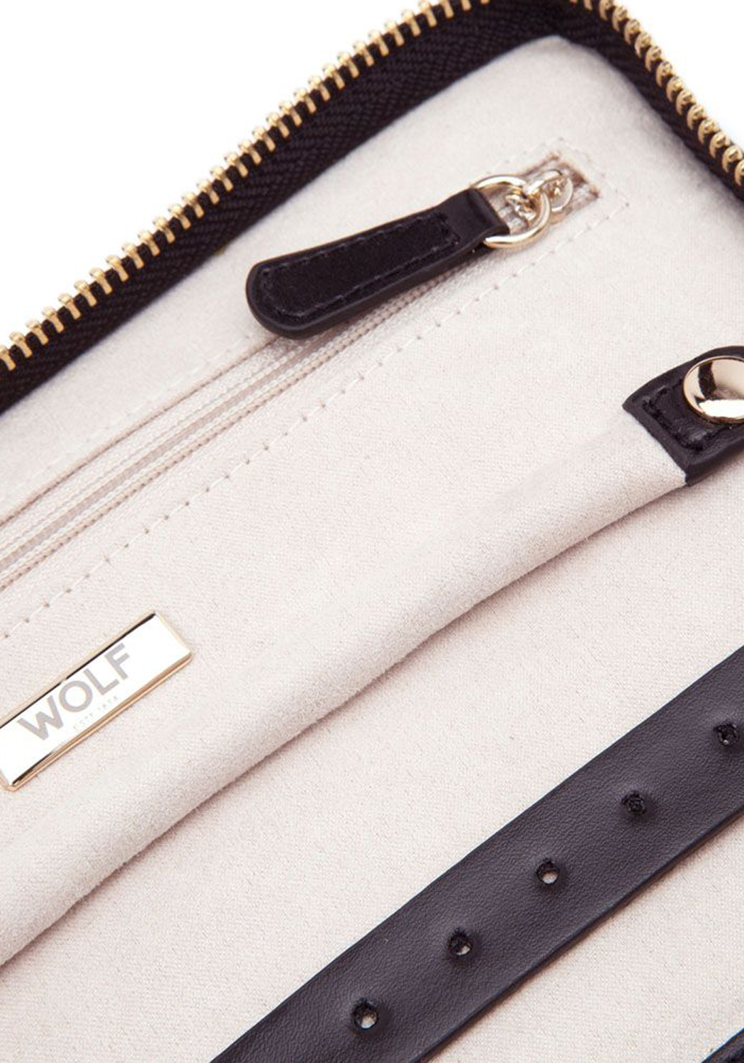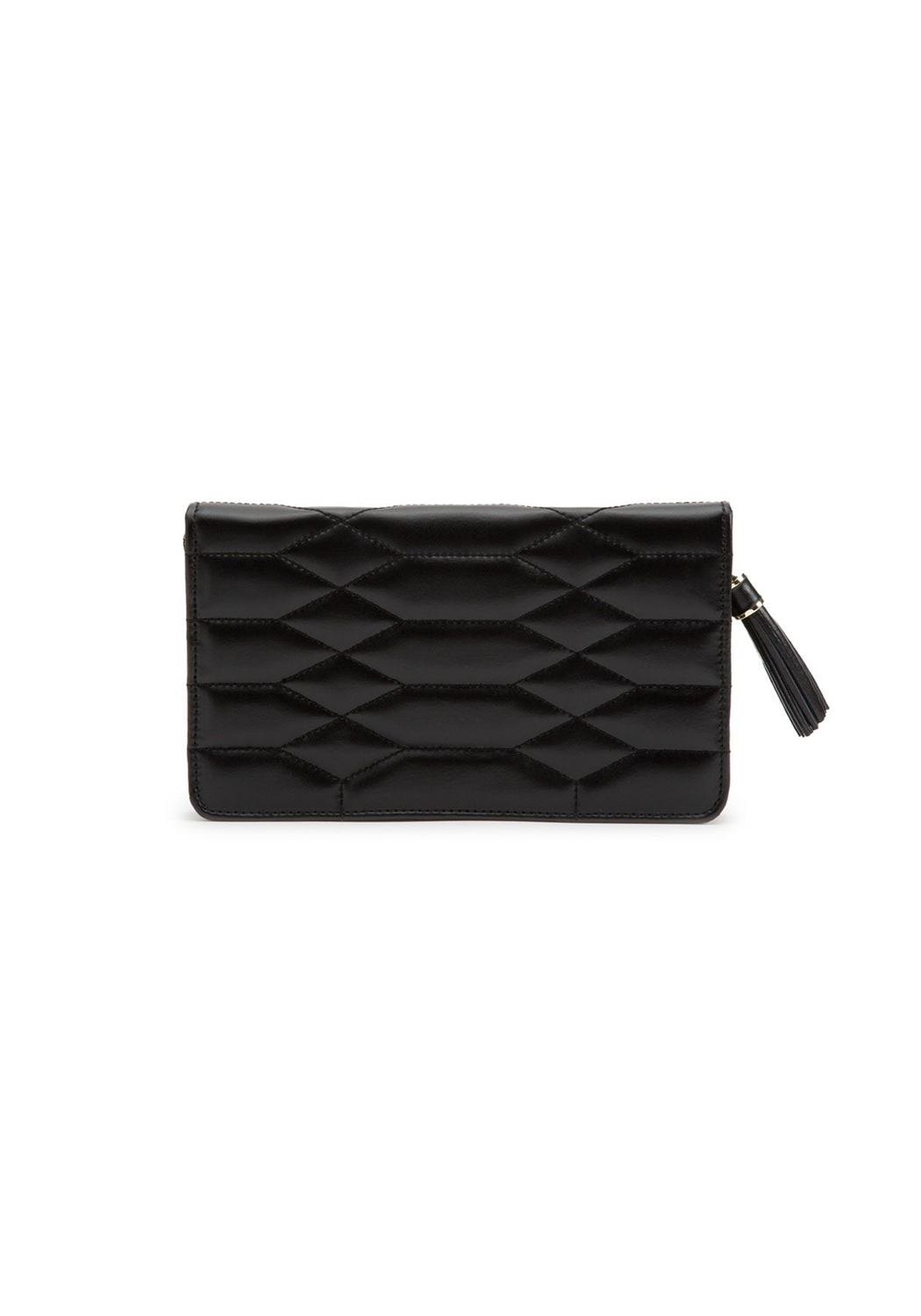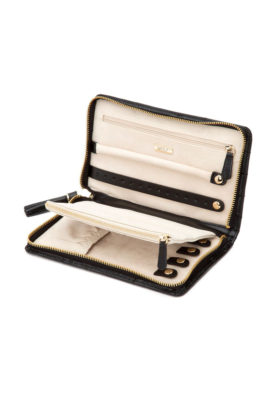 The Wolf Caroline Black Leather Jewelry Portfolio is a timeless essential for those who appreciate both elegance and practicality. Crafted from supple, diamond-quilted leather and accented with gleaming gold hardware, this luxurious case is designed to safeguard and showcase your finest jewelry. Inspired by the sophisticated curves of 1950s design, it offers both vintage charm and modern functionality. With thoughtfully designed compartments, it ensures effortless organization whether at home or while traveling. Perfect for securing heirloom pieces and everyday favorites, the Caroline Jewelry Portfolio is the ultimate blend of style and protection.