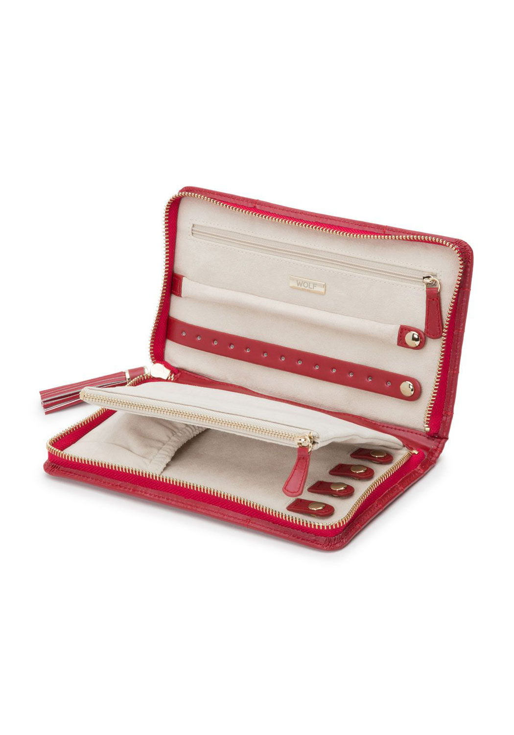 A timeless symbol of elegance, the Wolf Caroline Red Leather Jewelry Portfolio blends vintage-inspired sophistication with modern functionality. Crafted from supple, diamond-quilted leather and accented with gleaming gold hardware, this luxurious case is designed to protect and showcase your most treasured jewelry and heirlooms. Inspired by the graceful lines of 1950s design, it offers a chic and secure way to store your pieces. Whether for safekeeping your fine jewelry or ensuring effortless organization on the go, the Caroline Jewelry Portfolio is the epitome of refined luxury.